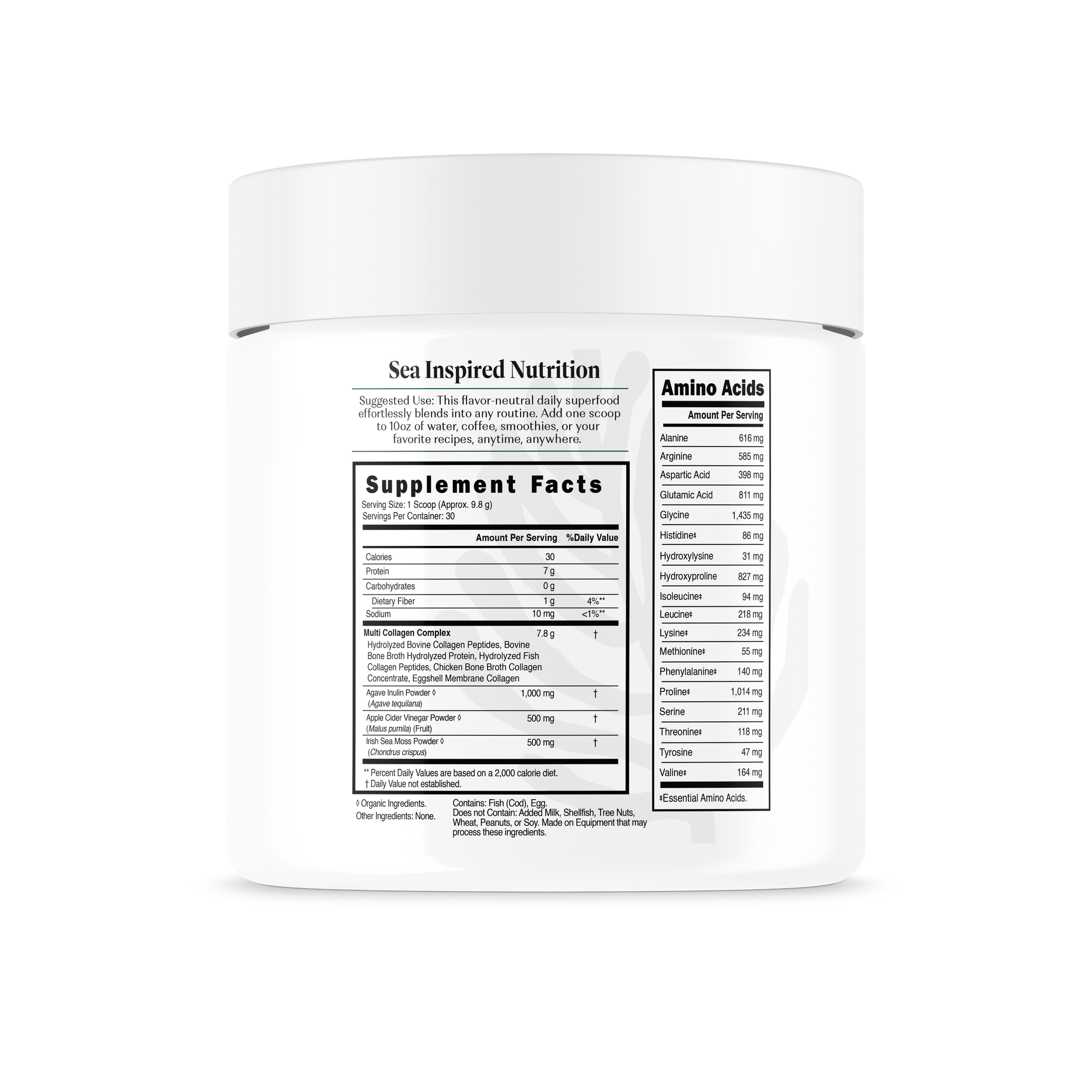 Introducing your daily dose of holistic wellness packed into one powerful superfood supplement. Crafted with nature's finest ingredients, including the remarkable benefits of Irish Sea Moss, Collagens, Amino Acids, Organic Apple Cider Vinegar, and Organic Agave. This formula is designed to nourish your body from the inside out, addressing key areas of health and vitality.